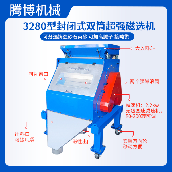 双筒强磁磁选机主要由2个永磁滚筒,机架、轴承、传动部分等组成,永磁滚筒是由2-3mm的不锈钢板卷焊接成筒状,使用不锈钢螺钉和筒子相连接,电机是2.2kw,220v的铜线电机,带动永磁半磁滚筒,磁辊等来回转动,磁铁不动,外皮滚筒转动,磁系为开放式磁系。