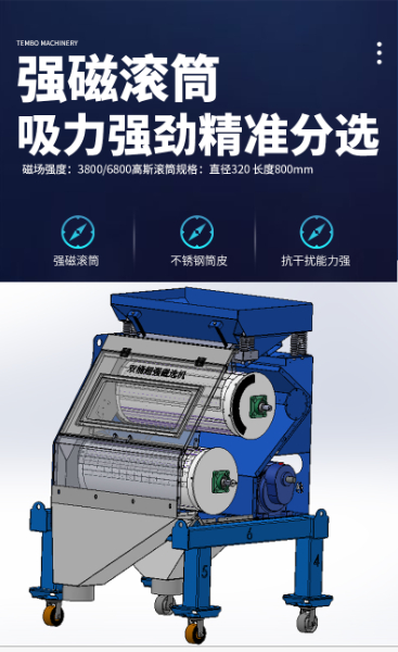 物料通过机械摆动给料装置均匀地给到正在旋转的半磁滚筒上部磁场区,磁性物质被吸附在滚筒表面,并随着滚筒一起转动。由于磁性材料与非磁性材料,在磁场中所受磁力不同,磁性颗粒在磁场内受磁力作用吸附在滚筒表面,带到非磁场区被甩下,非磁性和弱磁性颗粒由于他们所受磁力不同,抛离的轨迹也不同。磁性越强抛离中越靠近滚筒。周围方向采用交变磁场,并以一定的角度和周期来摆动,最后达到分离的作用。